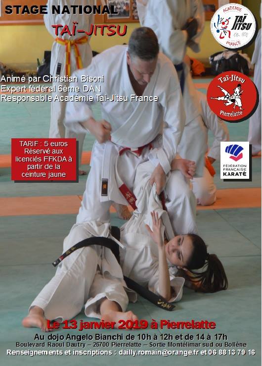 Le club de Pierrelatte organise un stage le dimanche 13 janvier 2019 de 10h00 à 12h00 et de 14h00 à 17h00. Il sera animé par Christian Bisoni, 6ème Dan, expert fédéral et responsable de l’Académie Tai Jitsu France, qui sera accompagné de Sophie Bisoni, 3ème Dan.