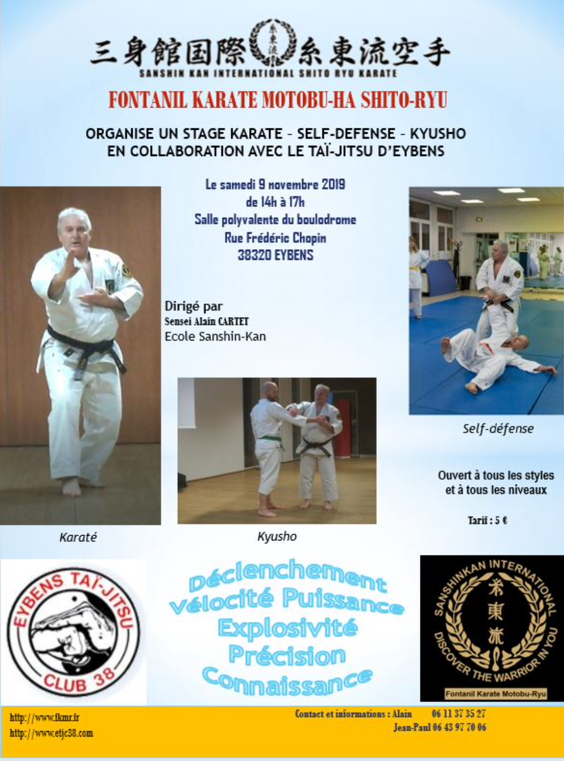 Stage Karaté – Self défense – Kyusho9 novembre 2019 dans Stage par Jean-Paul FAURE Chargement de la carte… Dojo28 rue Frédéric Chopin - EybensÉvènement 45.15615 5.747760599999992 Date / Heure Date(s) - 09/11/201914 h 00 min - 17 h 00 min Emplacement Dojo Catégories Stage